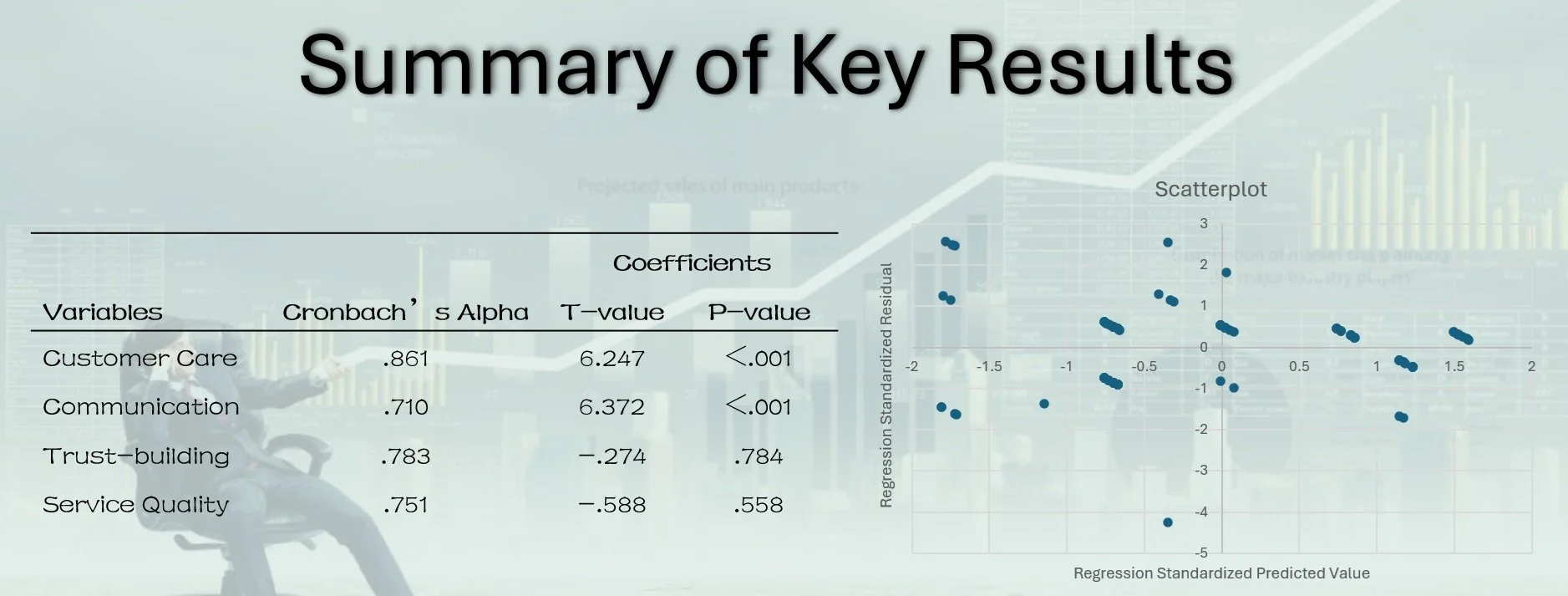 In my research (Chau & James, 2025), I explore the relationship between customer retention and business success, examining 4 critical independent variables: Customer Care, Communication, Trust-Building, and Service Quality. These factors were hypothesized to influence customer retention and drive long-term business success. Based on a survey of over 100 consumers in Hong Kong, the data reveals good internal consistency across all variables. Statistical analysis shows that Customer Care and Communication significantly positively affect customer retention. However, contrary to initial expectations, Trust-Building and Service Quality did not show statistically significant relationships with customer retention. The below scatterplot shows a relatively random pattern around zero, suggesting that my regression model assumptions of homoscedasticity and linearity are reasonably met. BTW overall Cronbach's Alpha values are notably good (ranging from .710 to .861).