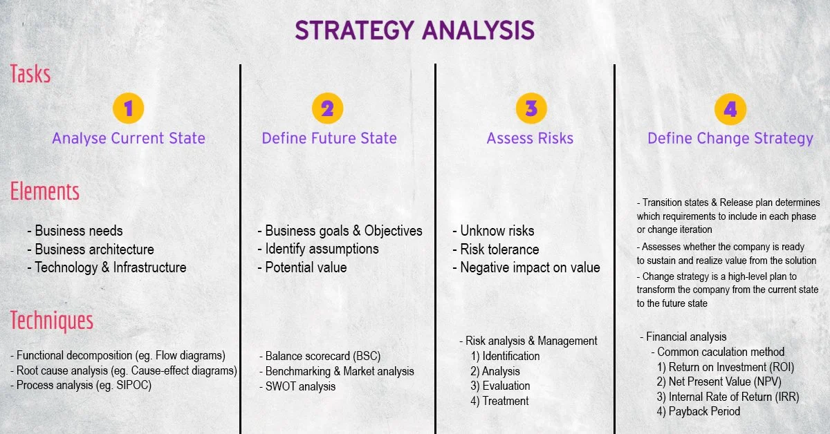 As defined by BABOK® Guide: In the field of strategic analysis knowledge, it is common to describe the analytical work that must be performed to collaborate with our stakeholders in order to: